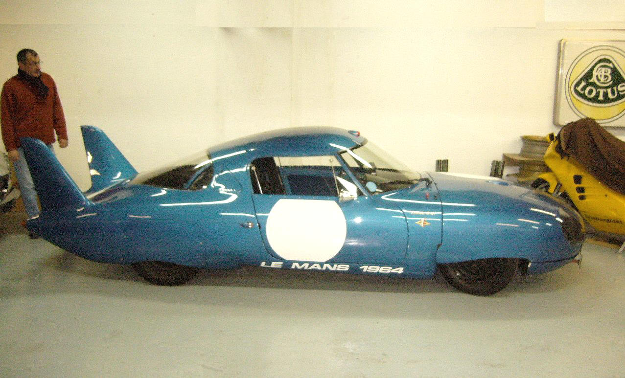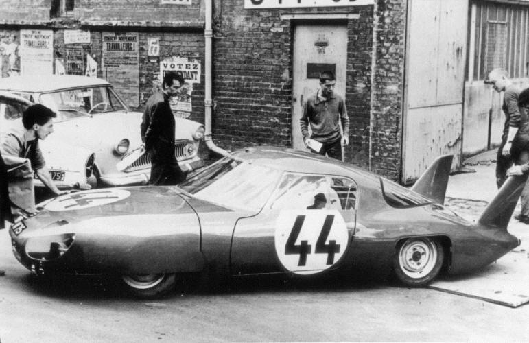 Découvrir des documents d'époque sur une automobile ancienne est toujours extrêmement intéressant et agréable : c'est en apprendre un peu plus sur son époque, et pas seulement sur l'histoire de l'auto elle-même. Sur la photo ci-dessous de la CD-Panhard créée par Charles Deutsch et son équipe pour les 24 heures du Mans 1964, on peut voir des affiches électorales sur les murs, une Simca "Versailles", et l'état même de la porte et de l'atelier en arrière-plan suggère toute l'émouvant contexte de cette aventure exceptionnelle. Le volume de la carrosserie est presque vivant, évoquant un mammifère marin.