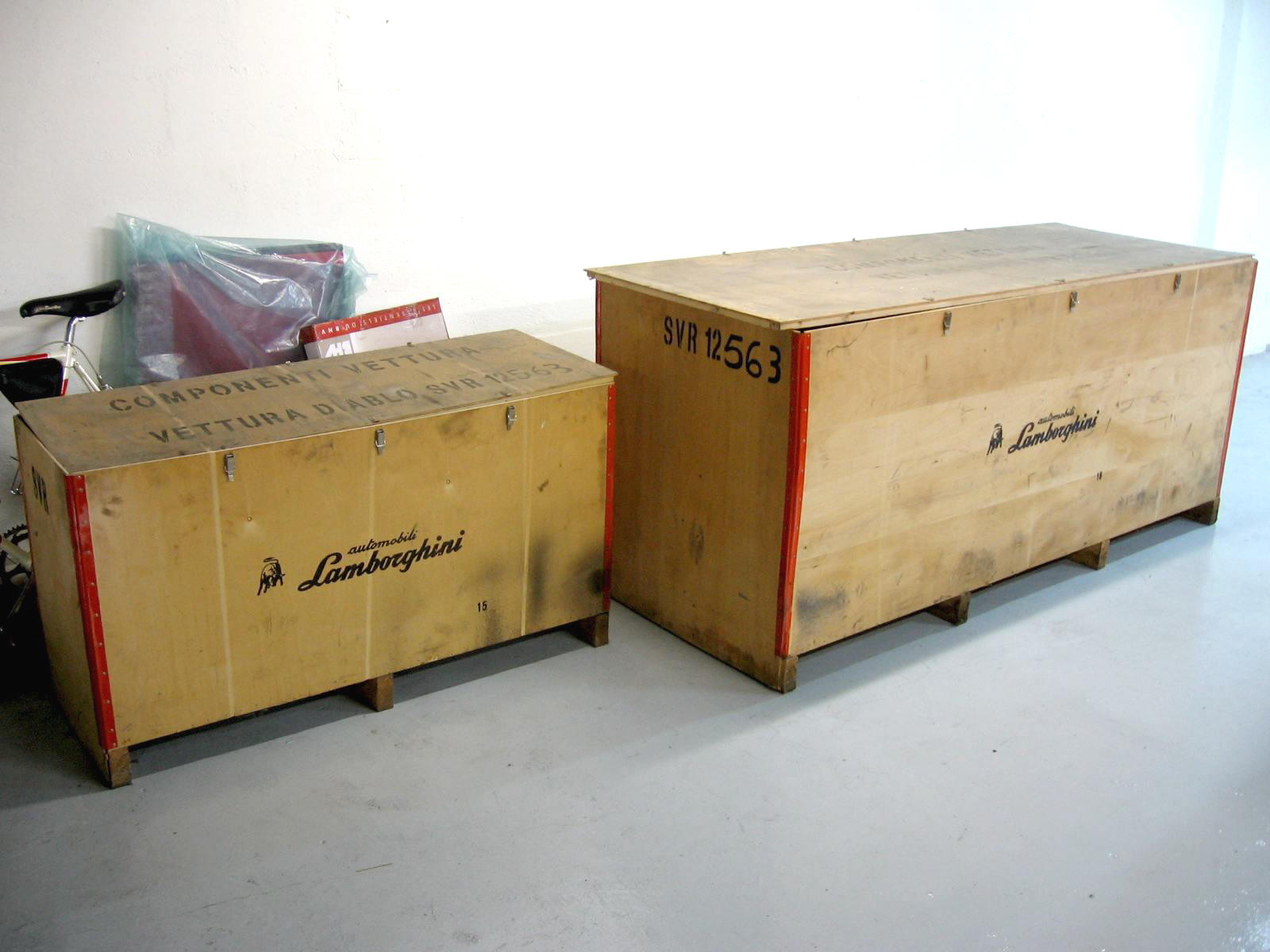 Ci-dessous, pour compléter l'acquisition de la Diablo SVR#23, Autodrome a obtenu deux containers complets abritant l'ensemble des pièces neuves à monter pour homologuer l'auto et rouler "en ville". Soigneusement emballées, les pièces telles qu'étriers de frein, glaces latérales en verre, feux avant et arrière, se montent comme un Mécano, puisque l'auto de course est sœur de celle de route... L'usine a bien fait les choses, rien ne manque, jusqu'au revêtement insonorisant...qu'on est libre de poser ou non. Nous avons acquis également des sièges de SV "de série", mieux finis et plus élégants que ceux de compétition de la SVR.