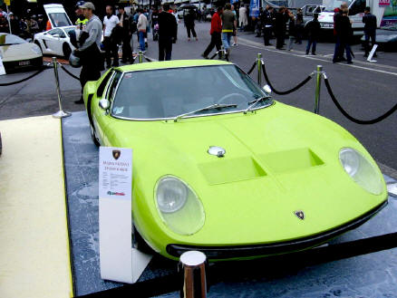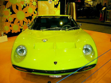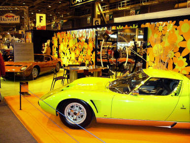 Décoration "années 70" sur le Stand de la Carrosserie Lecoq: deux Miura vendues par AUTODROME sont présentées, l'une vert vif