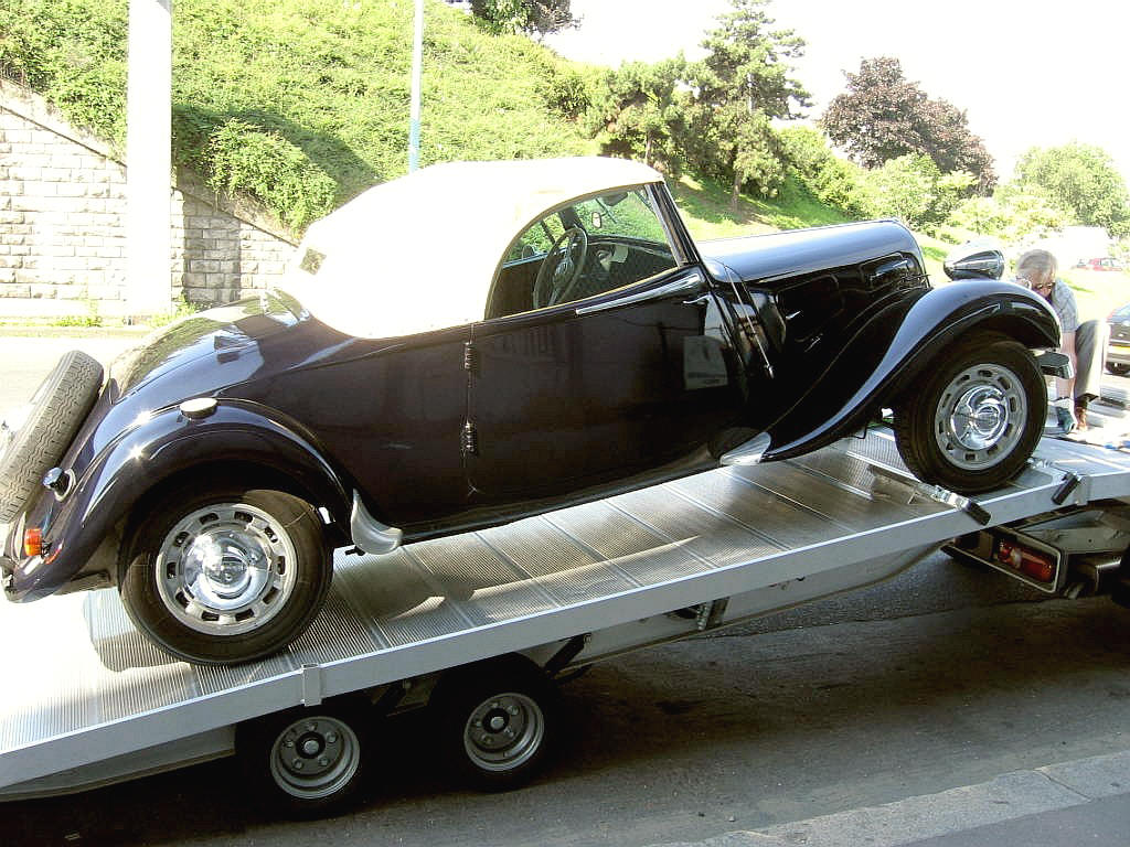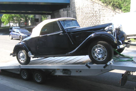 L'embarquement sur le camion de livraison offre une vue saisissante sur l'élégance animale du style du Cabriolet Traction.