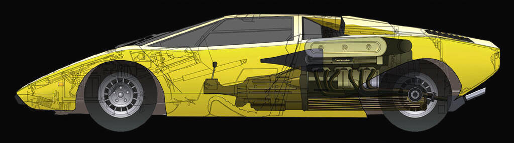 Vue éclatée de la LP400 : une conception sans aucun compromis, issue de la recherche de performance et de la capacité créatrice exceptionnelle de Lamborghini.