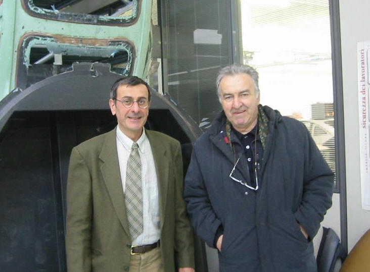 Neldo Levy (Autodrome Paris) et Ubaldo Sgarzi, à l'usine Pagani, devant des pièces de Zonda en carbone brut à l'usine Pagani.