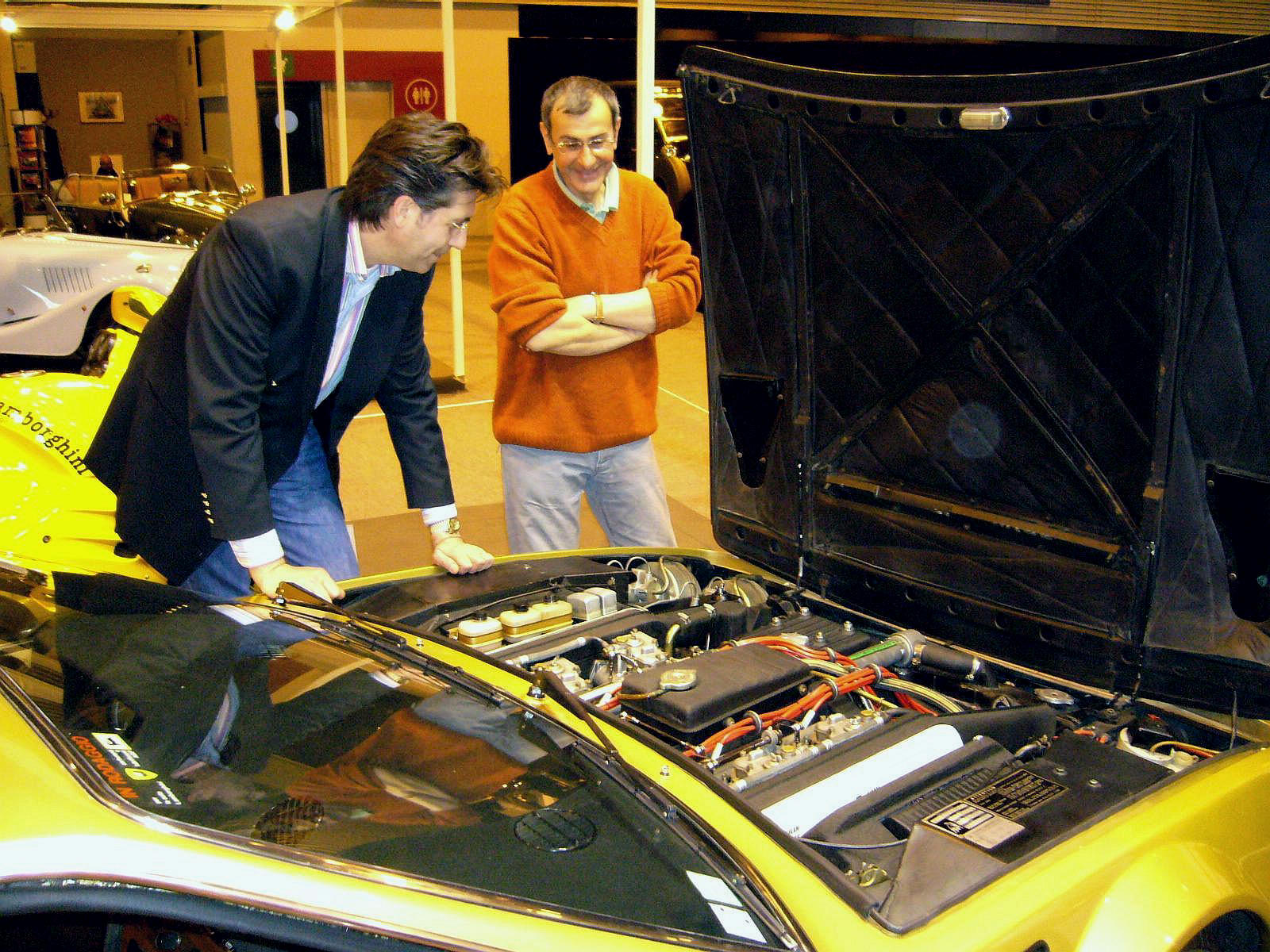 Olivier Namèche, "expert ès-Lamborghini Jarama", le créateur du registre Jarama, examine avec intérêt notre exemplaire, présenté par Neldo Levy.