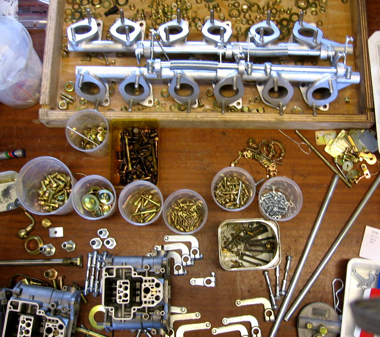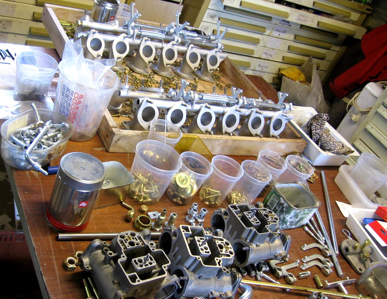 Une restauration soignée, dans les règles, demande patience, compétence et amour de la belle ouvrage. Ces photos montrent une partie des pièces composant les deux batteries de carburateurs Weber qui alimentent le V12 de notre Lamborghini 400 GT en cours de remise à neuf complète.