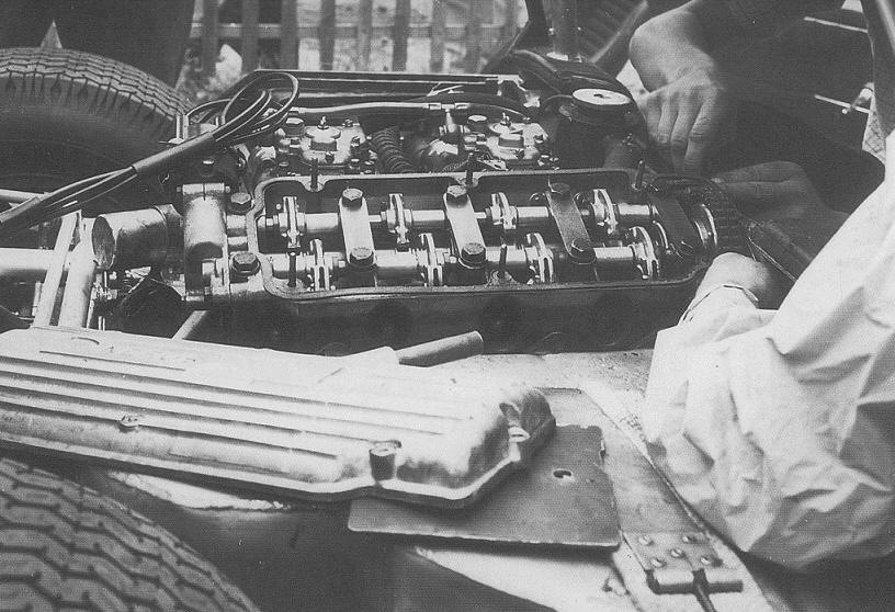 Photo d'archive : le moteur d'une ASA 1000 GT (berlinette) coiffé d'un couvre arbre à cames frappé du nom Ferrari, révélant sa noble origine. C'est un des premiers exemplaires, répertorié comme ayant été la propriété de l'usine.