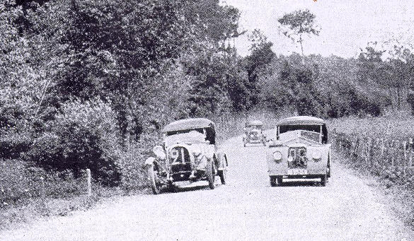 Une image de la course : la EHP de Dollfus est à droite. Les capotes sont relevées, sans doute en raison d'une averse.