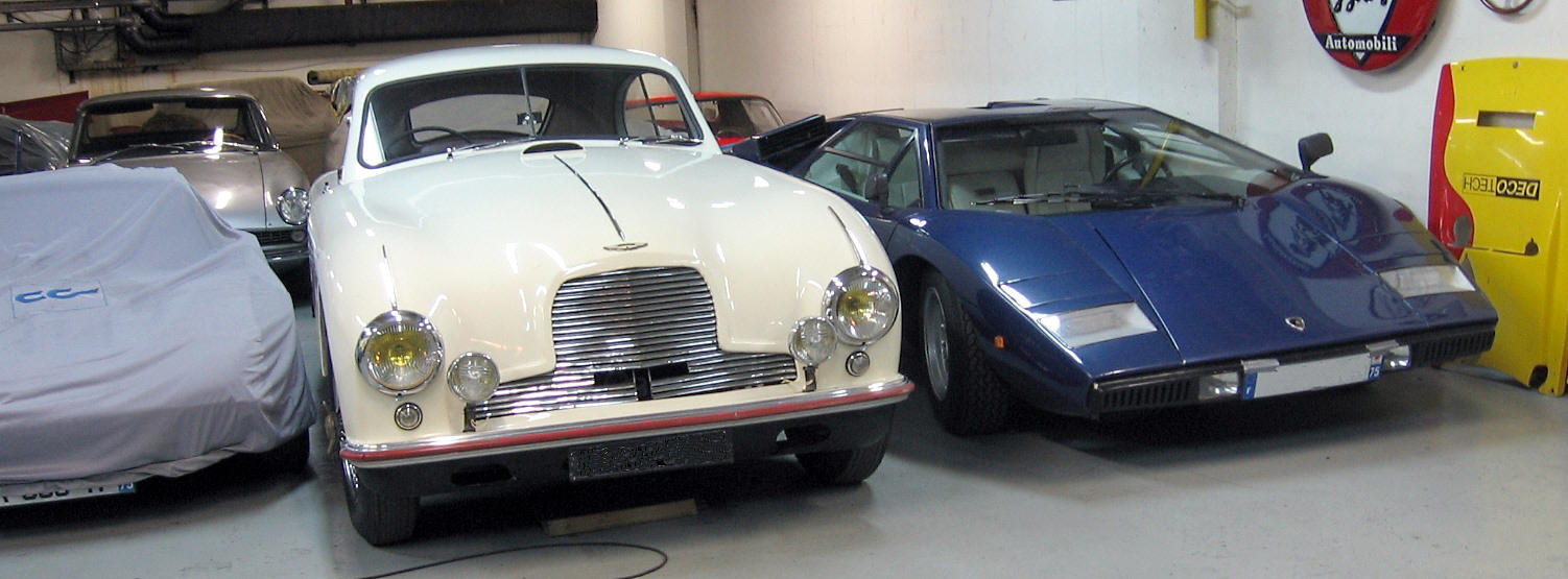 Dans les réserves d'Autodrome Paris, se rencontrent plusieurs générations d'automobiles sportives anciennes. Il est intéressant d'observer les différences de forme, de taille et de technique.De droite à gauche: Lamborghini Countach LP400 1975 (moteur central V12), Aston Martin DB2 1952 (moteur avant 6 en ligne), et sous la bâche, la petite Jidé 1974 à moteur central 1600 Gordini.