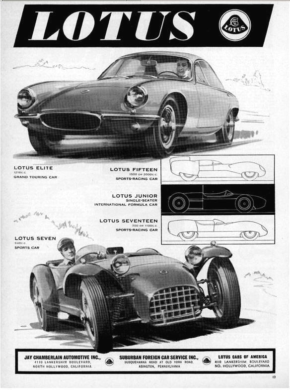 Publicité d'époque : l'Elite fut pratiquement la première Lotus à n'être pas une auto de course.