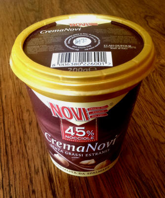Et comme nous cherchons toujours une information complète pour mieux vous éclairer sur nos passions partagées, précisons que la même crème exactement est disponible sous la marque Baratti & Milano (Crema alle nocciole) ; le conditionnement est décoré de manière plus "haut de gamme", et elle est vendue à un prix plus élevé. Notre choix se porte donc sur le Novi. Bon appétit à tous.