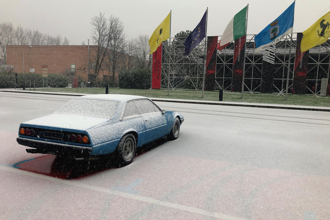 Quelle plus belle illustration des traditionnelles fêtes de fin d'année que cette image d'une somptueuse Ferrari 365 GT/4 s'éveillant à l'aube, sous une légère neige italienne ?