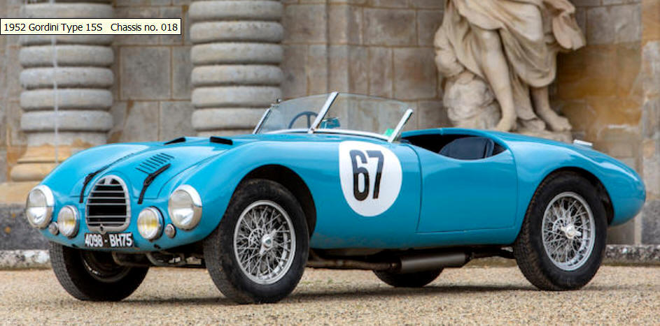 Pour sa vente aux enchères du château de Chantilly, la maison Bonhams proposait en vedette et en couverture du catalogue, une sensationnelle Gordini Type 15S de 1952. C'est l'une des deux seules existant au monde, l'autre étant la propriété du Musée Schlumpf. Cet exemplaire, né en monoplace, bénéficie d'un palmarès brillant, incluant plusieurs victoires de classe et participations au 24 H du Mans. Elle a été pilotée par rien moins que Juan Manuel Fangio, Jean-Pierre Wimille et Jean Behra, entre autres. Amedée Gordini, ingénieur italien installé en France avant-guerre, fut surnommé "Le sorcier de la mécanique" pour son talent et ses compétences hors-pair dans la création et le développement de moteurs 4, 6 et 8 cylindres, et de voitures de course racées et performantes.