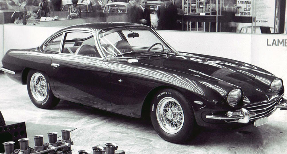 La première présentation de la Lamborghini 350 GT, biplace en aluminum, munie d'un V12 à 4 ACT (Turin 1963)