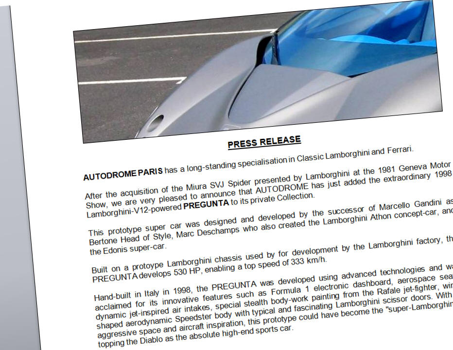 Voila une douzaine d'années, en 2006, un communiqué de Presse d'AUTODROME annonçait l'acquisition par notre Société de la spectaculaire Lamborghini Pregunta...Présentée à Genève en 1998, elle fut l'ultime prototype de la période mythique durant laquelle Lamborghini n'était pas encore intégrée au Groupe Audi. Notre passion pour ce constructeur n'avait fait que se renforcer depuis la mémorable présentation de la 350 GT, puis de la Miura ; nous n'avions donc pas hésité une seule seconde lorsque s'est présentée la possibilité de faire entrer cette automobile unique au monde dans nos garages.
