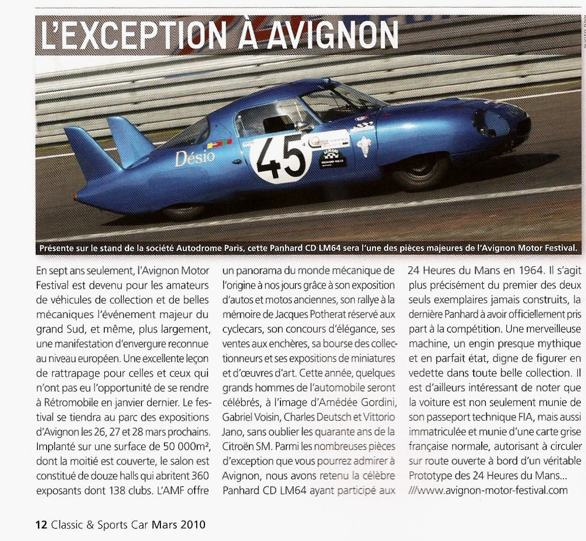 AUTODROME EXPOSE LA PANHARD-CD LE MANS 1964 POUR LE 7ème AVIGNON MOTOR FESTIVAL