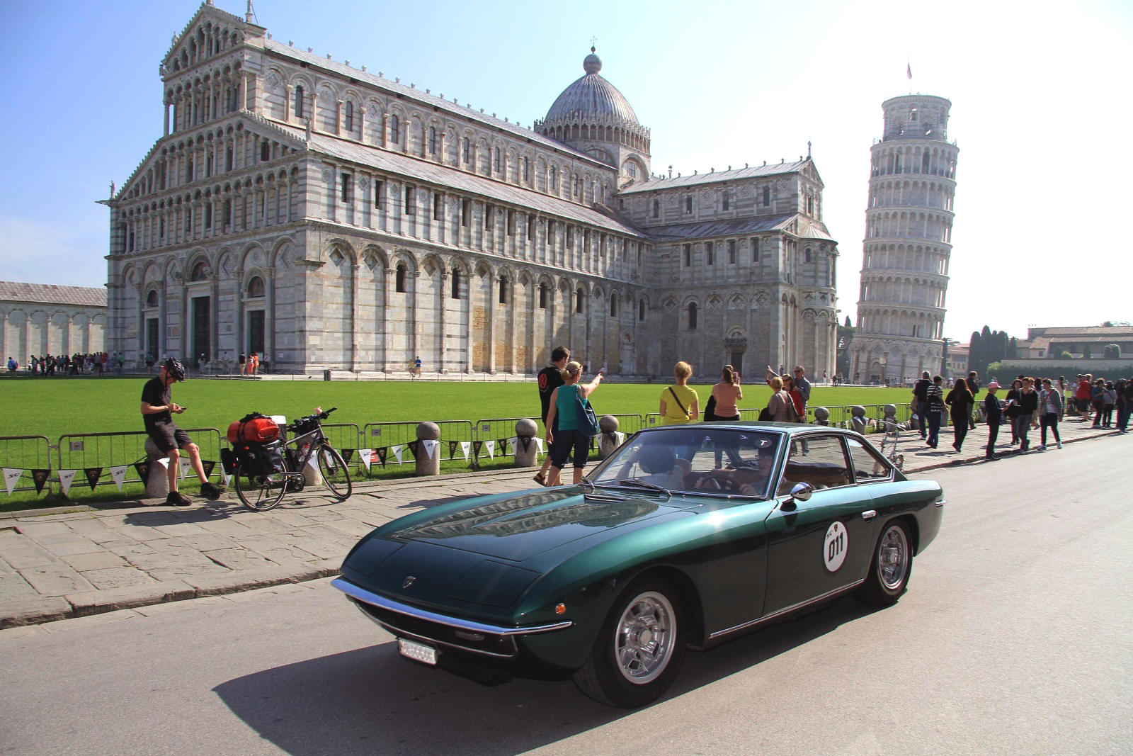 Photo de gauche : la superbe Islero de notre client arbore fièrement ses formes sculturales à Pise, devant un autre chef d'oeuvre de l'Art italien...