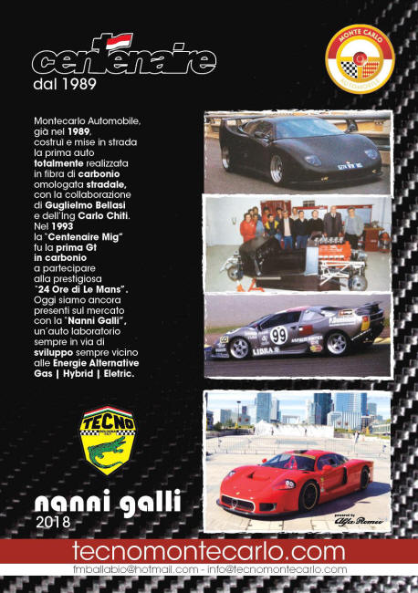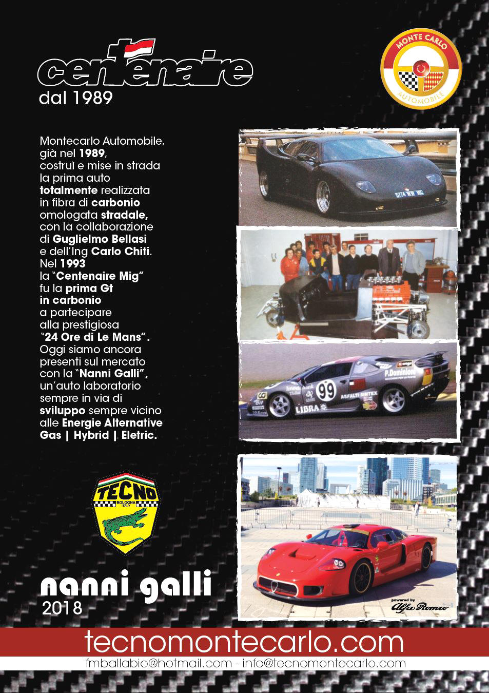 Autodrome Paris possède la première GT en carbone au monde : c'est la Centenaire, une biplace à moteur V12 Lamborghini, créée par la marque monégasque Monte-Carlo Automobile. Ce constructeur, dont le directeur technique fut à l'époque Carlo Chiti, ex-ingénieur en chef Ferrari et Autodelta, construit aujourd'hui des automobiles de compétition. Après avoir fusionné avec Tecno, la célèbre marque de monoplaces de course, Monte-Carlo Automobile rend hommage à Nanni Galli, pilote qui s'illustra dans les années 70 notamment en Sports-Prototypes et en Formule 1.