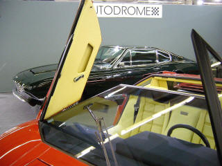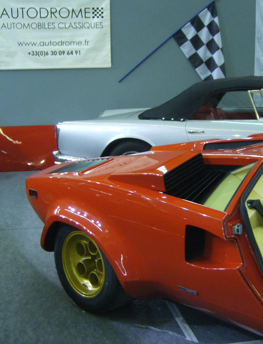 - Une Countach LP400 première série, dite "periscopica", dont la peinture et la sellerie ont été somptueusement restaurées par la Carrosserie Lecoq (cette voiture est disponible à la vente, nous consulter). Elle était la star de la rétrospective, avec la fabuleuse 350 GT d'Edmond Ciclet : cette auto est inscrite dans l'Histoire comme l'une des cinq ou six premières Lamborghini fabriquées.