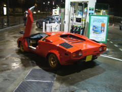 A g. : les voitures à peine arrivées sur le stand. Centre : la Flaminia Touring 2,8 l., un régal à conduire. A dr. la Countach Spider ravitaille au petit matin.