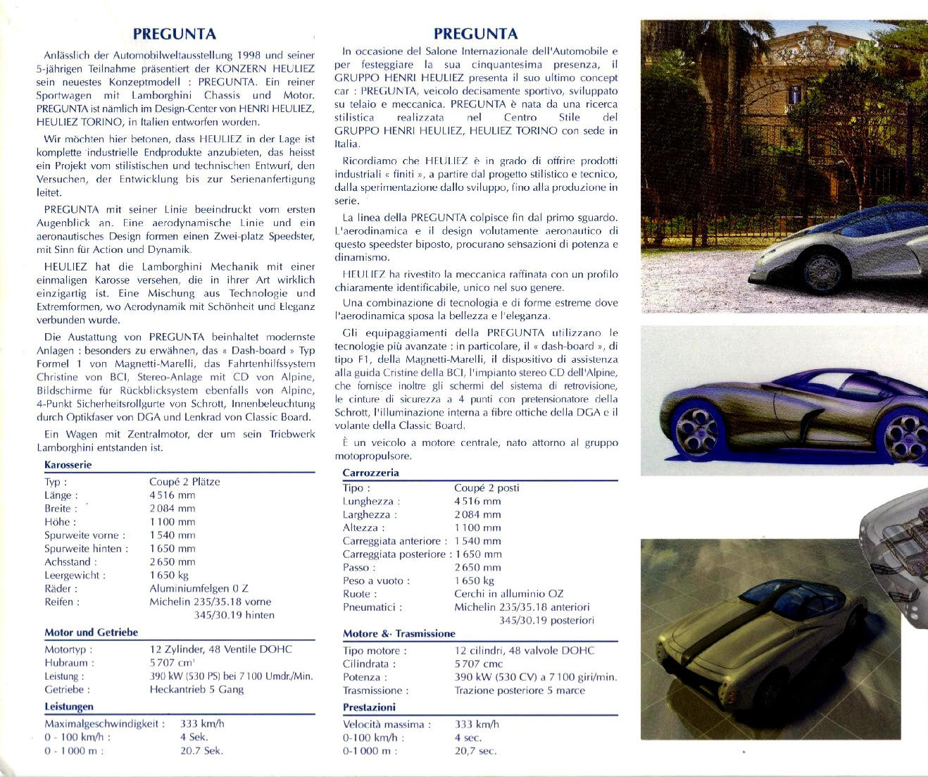 Considérée comme l'ultime prototype de "l'ère italienne" de Lamborghini, la Pregunta V12 présentée au Salon de Paris en 1998 et à Genève en 1999 est un concept-car entièrement fonctionnel, doté de technologies d'avant-garde pour l'époque. Construit sur un châssis Diablo de développement de l'usine, il a été modifié en deux roues motrices pour plus de légèreté, et les radiateurs d'eau sont implanté à l'avant.